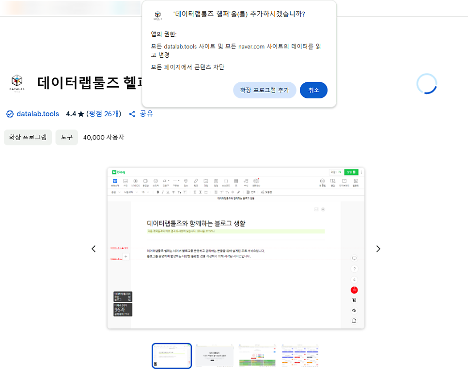 데이터랩툴즈 헬퍼 통해 들어간 화면에서는 오른쪽 상단에 위치한 파란 버튼인 chrome에 추가 버튼을 통해서.