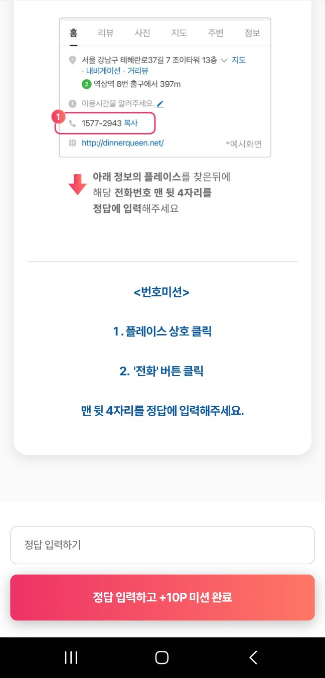 정답 입력하기 란에 전화번호 뒷 4자리를