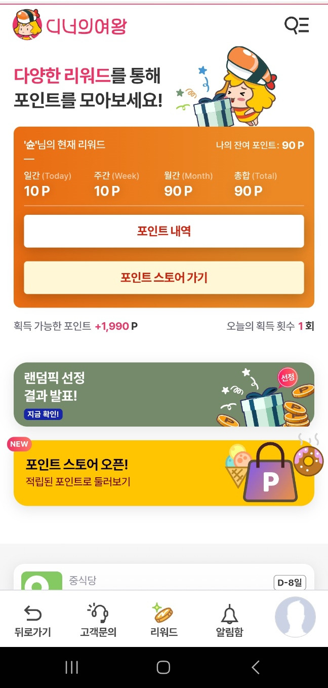 ① 디너의여왕 어플 하단에 보이는 리워드를 클릭해줍니다