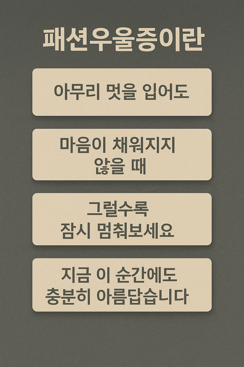 - 비교와 기준을 내려놓고, 나만의 리듬으로 멋을 입어보세요.